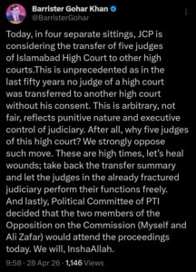 سوشل میڈیا ویب سائٹ ایکس پر اپنے ایک بیان میں بیرسٹر گوہر نے اعتراض اٹھایا کہ گزشتہ پچاس سالوں میں پہلی بار ججز کی رضامندی کے بغیر ان کی منتقلی کی جا رہی ہے، جو کہ عدلیہ پر دباؤ اور کھلی مداخلت کے مترادف ہے۔ انہوں نے واضح کیا کہ سیاسی کمیٹی میں شامل اپوزیشن ارکان جوڈیشل کمیشن کے اجلاس میں شرکت کریں گے، جبکہ وہ خود اور سینیٹر علی ظفر بھی آج ہونے والے کمیشن کے اہم اجلاس میں شریک ہو کر اپنا موقف پیش کریں گے۔
