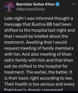 بیرسٹر گوہر نے مطالبہ کیا کہ بشریٰ بی بی کو ان کے اہل خانہ سے ملنے کی فوری اجازت دی جائے، جبکہ بانی پی ٹی آئی عمران خان کی بھی ان کے فیملی ممبران سے ملاقات کو یقینی بنایا جائے۔ انہوں نے زور دیا کہ علاج معالجے کی سہولیات تک بروقت رسائی ہر شہری کا بنیادی اور قانونی حق ہے جس سے کسی کو محروم نہیں رکھا جا سکتا۔