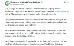 ترجمان دفتر خارجہ کے مطابق اسحاق ڈار سے امریکی ناظم الامور نیٹلی بیکر نے ملاقات کی جس میں حالیہ علاقائی پیش رفت پر تبادلہ خیال کیا گیا۔
