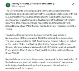 امریکی شہر نیویارک میں روز ویلٹ ہوٹل کی بحالی کےلیے پاکستان اور امریکاکے درمیان مفاہمت کی یادداشت پر دستخط ہوگئے۔ وزارت خزانہ کے مطابق وزیرخزانہ محمد اورنگزیب اور امریکا کی طرف سے ایڈمنسٹریٹر ایڈورڈ سی فورسٹ نےایم اویوپر دستخط کیے۔اس موقع پر وزیراعظم شہبازشریف اور امریکی نمائندہ خصوصی اسٹیووٹکوف بھی موجود تھے۔