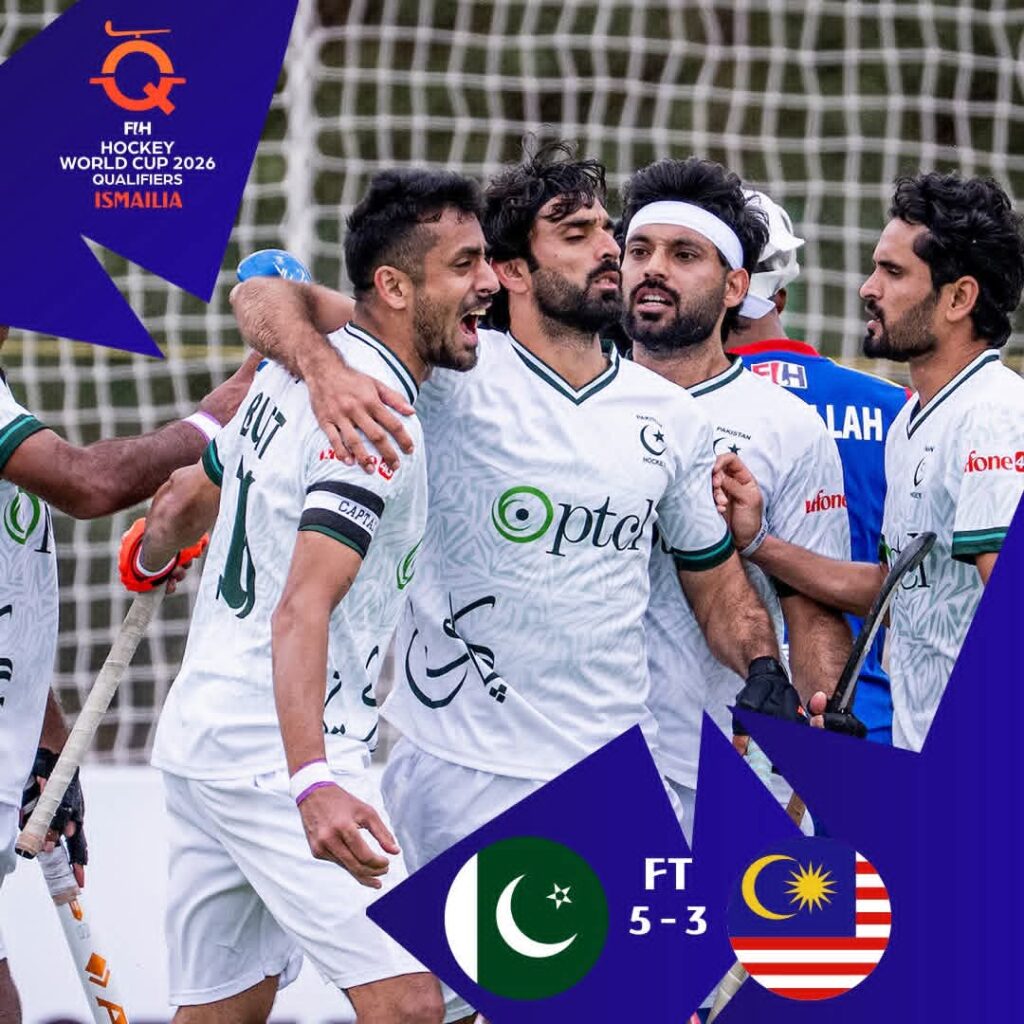 یکم تا 7 مارچ کھیلے جانے والے مینز ہاکی ورلڈ کپ میں شرکت کےلیے پاکستانی ہاکی ٹیم کی پیش قدمی۔ مصرمیں  ورلڈکپ کوالیفائرراؤنڈ کے دوسرے میچ میں ملائیشیاکو تین کے مقابلے میں پانچ گول سے شکست دے کر سیمی فائنل میں جگہ بنالی۔