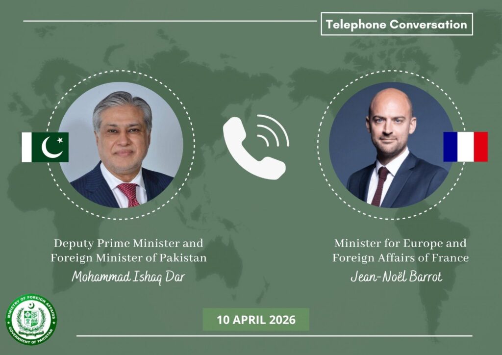 ترجمان دفترِ خارجہ کے مطابق، پاکستان کے نائب وزیراعظم اور وزیرِ خارجہ اسحاق ڈار اور ان کے فرانسیسی ہم منصب کے درمیان ایک اہم ٹیلیفونک رابطہ ہوا ہے، جس میں مشرقِ وسطیٰ کی تازہ صورتحال اور دو طرفہ تعلقات پر تفصیلی تبادلہ خیال کیا گیا۔ فرانسیسی وزیرِ خارجہ نے ایران اور امریکا کے درمیان جنگ بندی کروانے اور خطے میں قیامِ امن کے لیے پاکستان کی کامیاب سفارتی کوششوں کی بھرپور تعریف کی اور اس سلسلے میں اسلام آباد کے فعال کردار کو سراہا۔