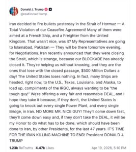 ٹرمپ کا کہناتھاکہ ایران نے کل آبنائے ہرمز میں گولیاں چلانے کا فیصلہ کیاجوسیز فائر کی خلاف ورزی ہے۔یہ عجیب بات ہے کیونکہ ہماری ناکہ بندی کی وجہ سے ہرمز پہلے ہی بند ہے۔