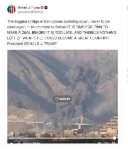 امریکی صدر ڈونلڈ ٹرمپ نے ایرانی شہرکرج میں پل کی تباہی کی ویڈو ٹروتھ سوشل پرجاری کردی۔۔کہتےہیں ایران کا بڑا پُل زمین بوس ہوگیا ہے، اس پُل کو اب کبھی استعمال نہیں کیا جا سکے گا۔