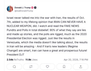 سوشل میڈیا پر جاری پیغام میں امریکی صدر کا کہنا ہے کہ ایران کے خلاف جنگ کے لیے اسرائیل نے انہیں نہیں اکسایا۔ا۔سات اکتوبر 2023 کے واقعے نے ان کے دیرینہ موقف کو تقویت بخشی کہ ایران کے پاس کبھی بھی جوہری ہتھیار نہیں ہونے چاہیئیں۔