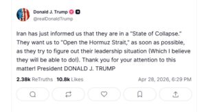 امریکی صدر نے سوشل میڈیاپر بیان میں کہاکہ ایران نے آبنائے ہرمز فوری کھولنے کامطالبہ کیاہے۔ ایران کے لوگ اپنی قیادت کی صورتحال کو سمجھنے کی کوشش کررہے ہیں۔ اورامید ہے وہ اس میں کامیاب ہوجائیں گے۔