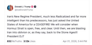 امریکی صدر نے کہا کہ درخواست پر تب غور کریں گے جب آبنائے ہرمز کھل جائے گی اور مکمل طور پر محفوظ ہو جائے گی۔ٹرمپ نے کہا کہ اگرامریکا کے کہنے کے مطابق نہ ہواتو ہم ایران کو مکمل طور پر تباہ یا پتھر کے زمانے میں واپس بھیج دیں گے۔
