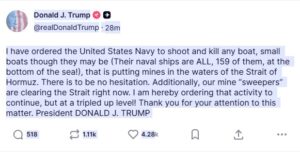 امریکی صدر ڈونلڈ ٹرمپ نے کہا کہ ہے کہ انہوں نے امریکی بحریہ کو حکم دے دیا ہے کہ آبنائے ہرمز میں بارودی سرنگیں بچھانے والی ہر چھوٹی یا بڑی کشتی کو نشانہ بنایا جائے۔